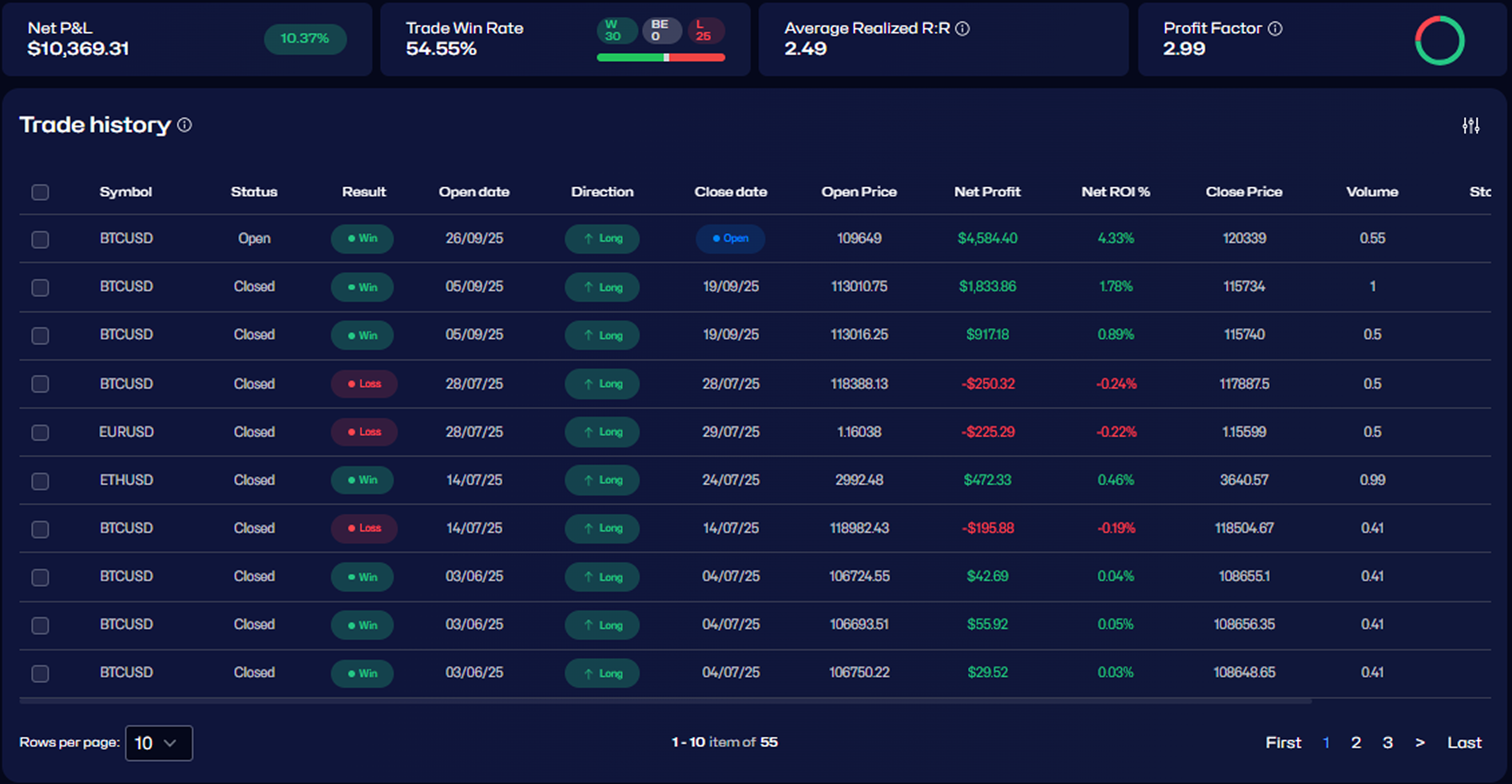 Review every trade you’ve made with detailed stats and insights to help refine your strategy.
