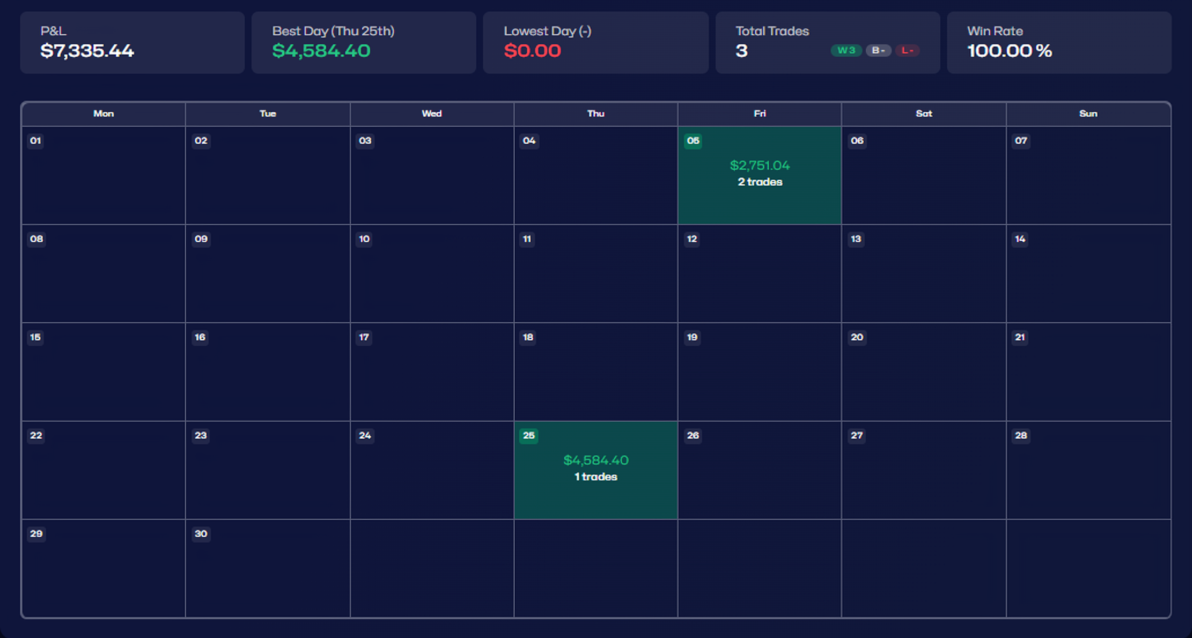 Track your trading sessions, payouts, and important market events with an organized visual calendar.